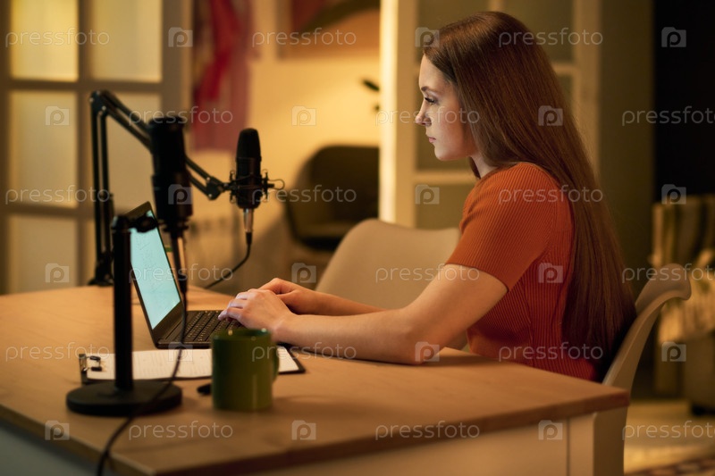 Подростковая девочка записывает подкаст с использованием ноутбука и микрофона дома