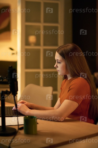 Подростковая девочка записывает подкаст с использованием ноутбука и микрофона в помещении