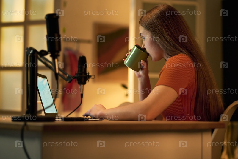 Подростковая девушка записывает подкаст, выпивая из кружки на столе