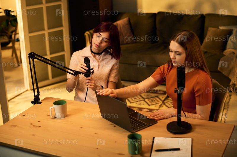 Две девочки-подростки записывают подкаст с микрофонами в студии