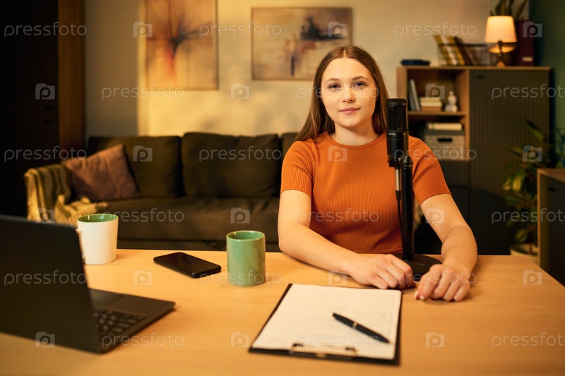 Портрет девочки-подростка записывает подкаст с микрофоном в помещении