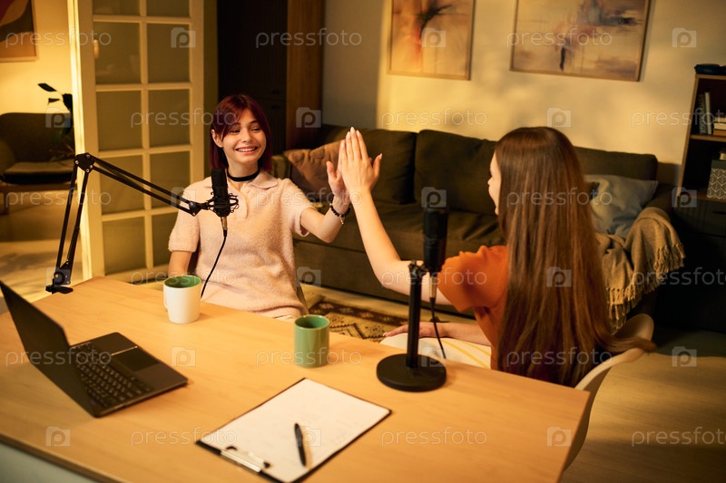 Две девочки-подростки записывают подкаст и дают высокую пятерку в студии