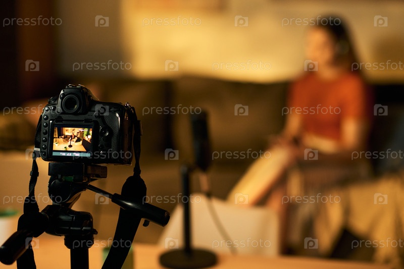 Подростковая девочка записывает подкаст с микрофоном в студии