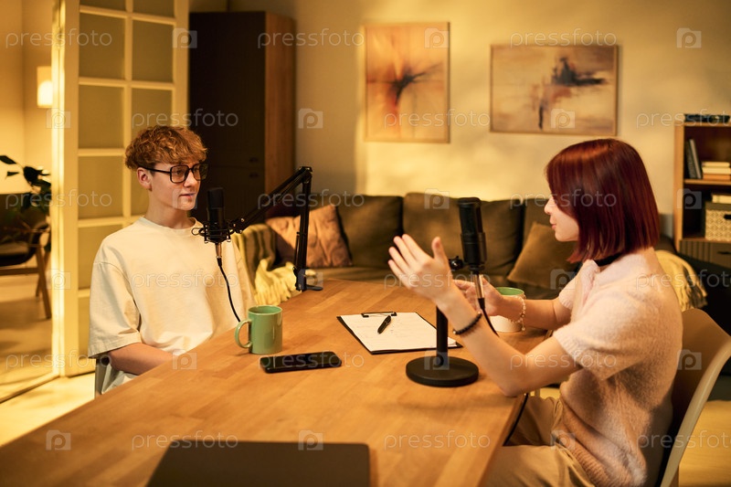 Подросток и девочка-подросток записывают подкаст разговора