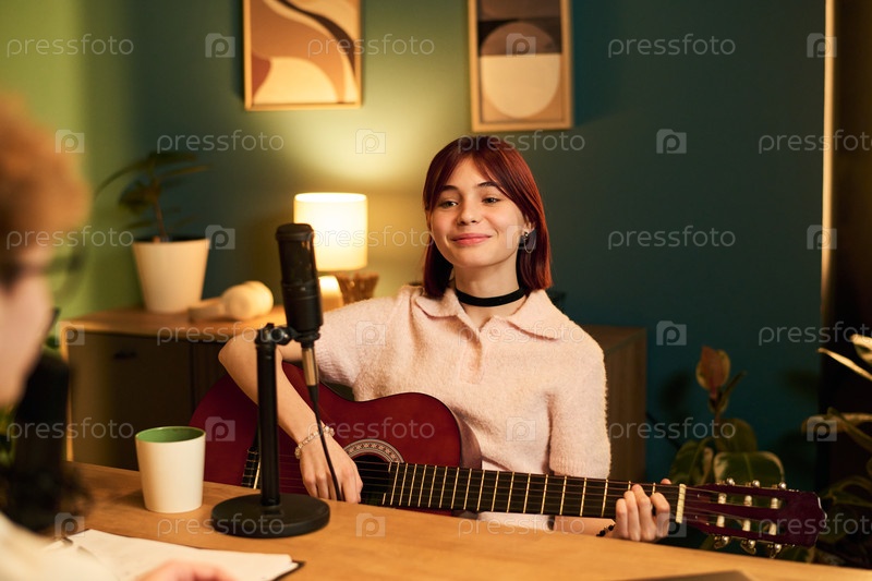Подростка записывает подкаст, играя на гитаре в студии