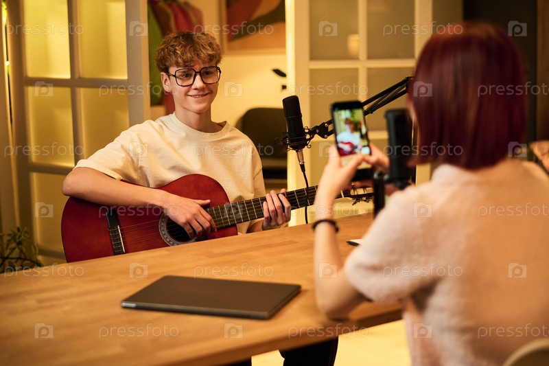 Подросток играет на гитаре Запись подкаста со смартфоном