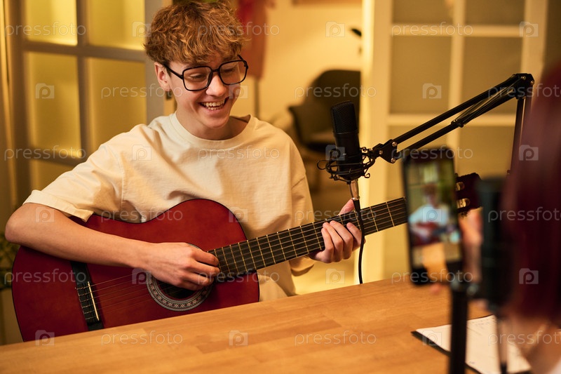 Ребенок-подросток записывает подкаст Играет на гитаре