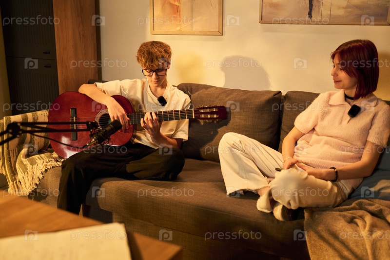 Подросток играет на гитаре, записывая подкаст с девочкой-подростком