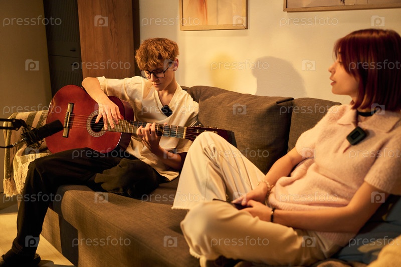 Подросток играет на акустической гитаре, в то время как девушка слушает во время подкаста