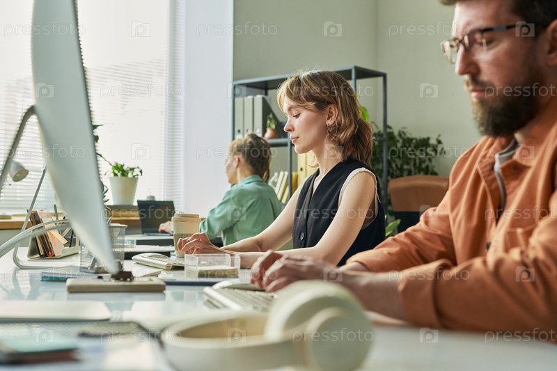 Молодая женщина развивает нейронную сеть с коллегами в офисе