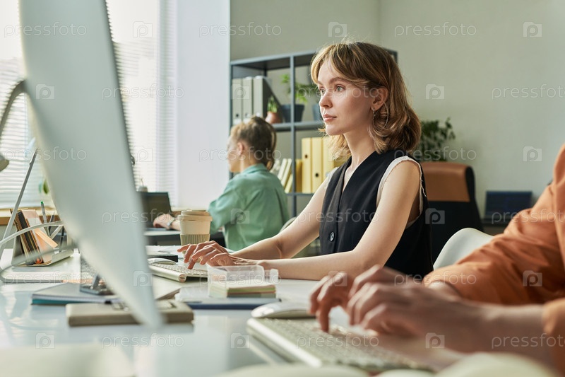 Молодая женщина разрабатывает нейронную сеть на компьютере в офисной обстановке