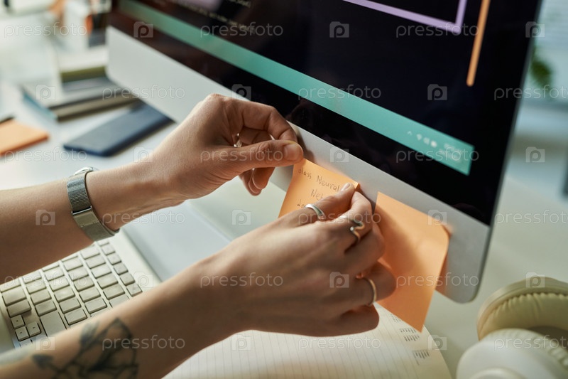 Молодая взрослая женщина развивает нейронную сеть и организует заметки