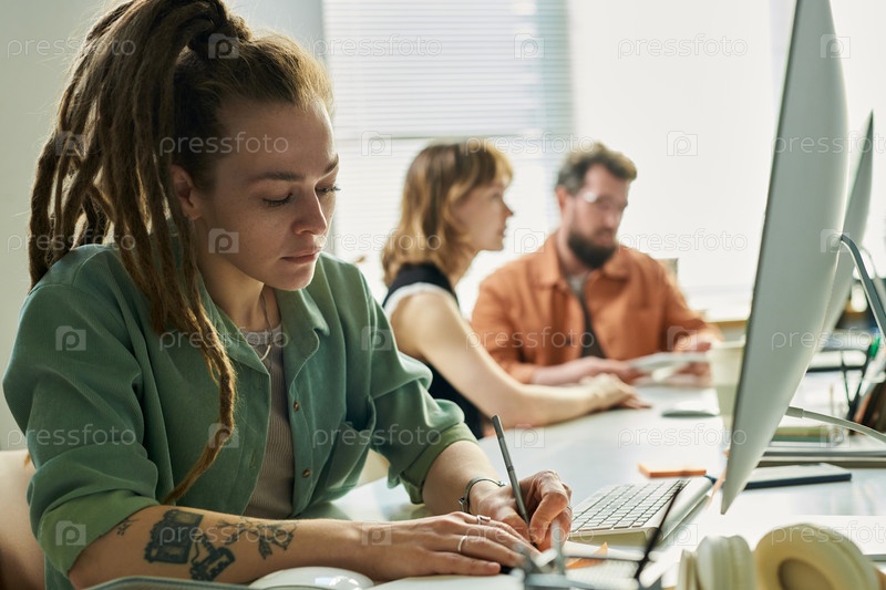 Молодая женщина разрабатывает нейронную сеть на компьютере в офисной обстановке
