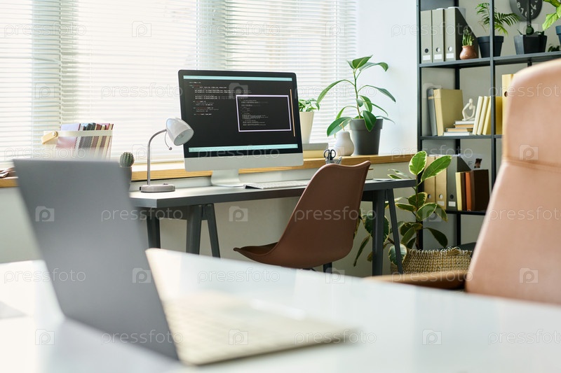 Офисное рабочее пространство с компьютером, разрабатывающим современный код нейронной сети