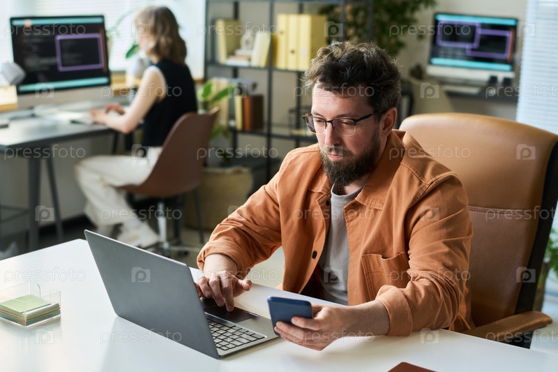 Молодой взрослый человек развивает нейронную сеть с помощью ноутбука и смартфона
