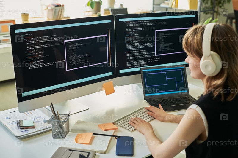 Женщина, разрабатывающая код нейронной сети на нескольких компьютерных экранах
