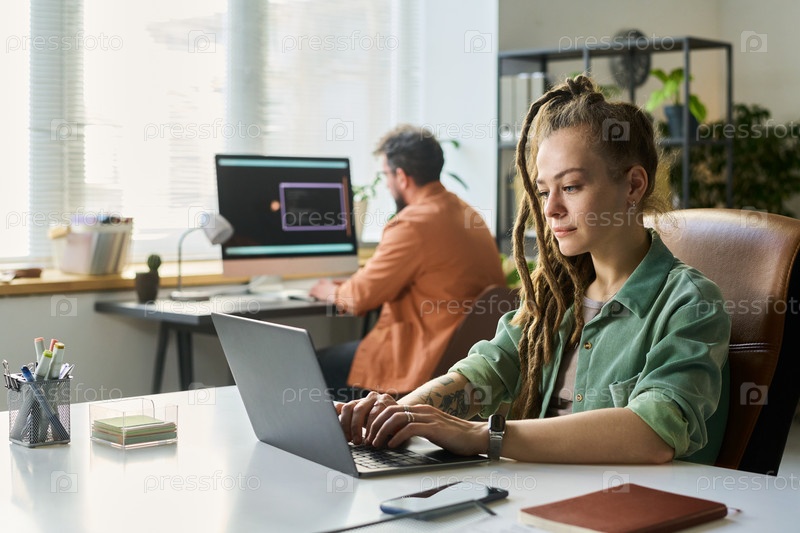 Молодая взрослая женщина программирует модель нейронной сети в Bright Office