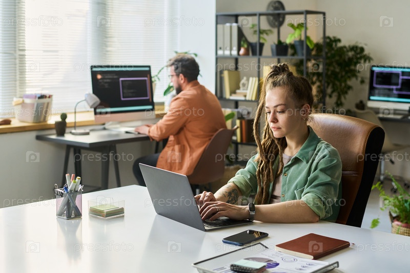Молодая женщина разрабатывает нейронную сеть на ноутбуке в современном офисе