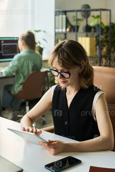 Молодая женщина использует цифровой планшет при разработке модели нейронной сети