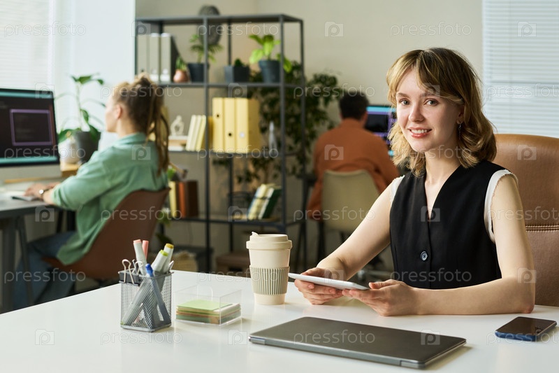 Портрет молодой взрослой женщины, улыбающейся в офисе