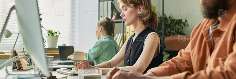 Молодая женщина разрабатывает нейронную сеть на компьютере в современном офисе
