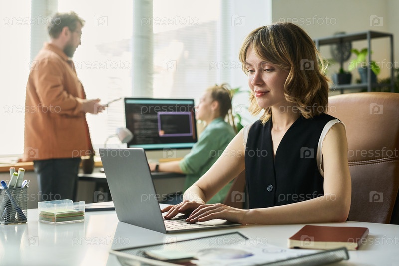 Молодая взрослая женщина, сотрудничающая в проекте нейронных сетей с командой