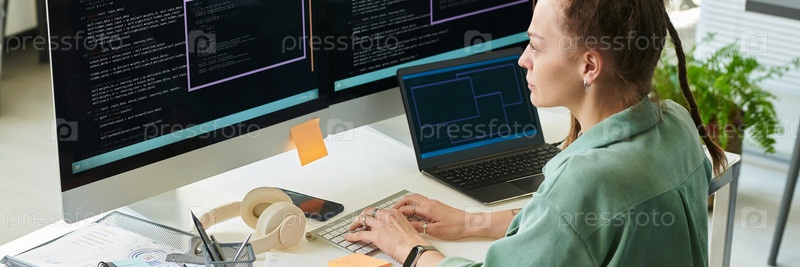 Молодая взрослая женщина пишет код нейронной сети на двойных экранах компьютера