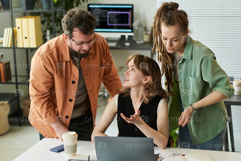 Молодая женщина обсуждает развитие нейронных сетей с коллегами