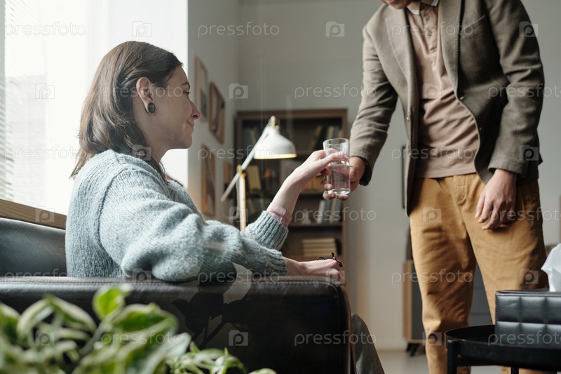 Молодая женщина получает стакан воды от мужчины во время терапии