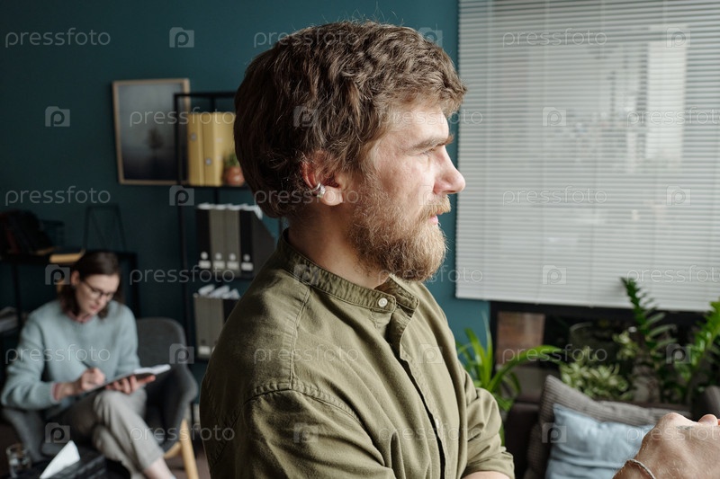 Молодой человек, размышляющий во время сеанса терапии с слушающим психотерапевтом