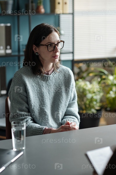 Молодая женщина посещает терапевтический сеанс с слушающим психотерапевтом
