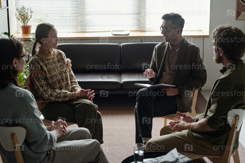 Мультиэтническая группа взрослых, участвующих в терапевтической сессии с консультантом