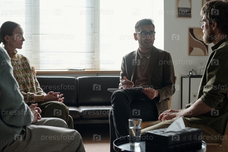 Ведущий групповой терапевтический сеанс с различными взрослыми мужчина