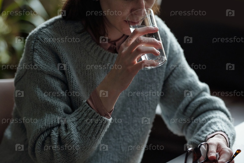 Молодая женщина пьет воду во время терапевтической сессии в помещении