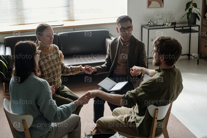Мультиэтнические молодые взрослые, участвующие в групповой сессии терапии, держась за руки
