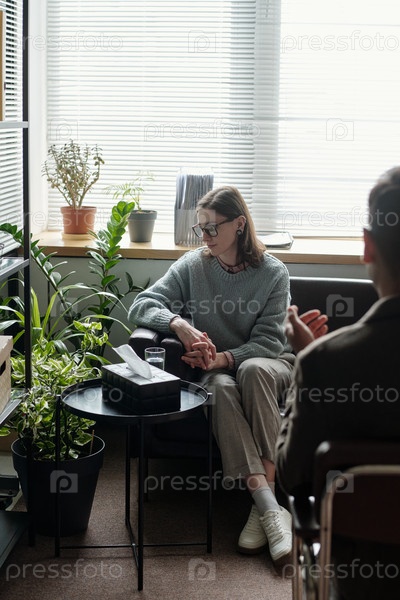 Молодая женщина посещает терапевтический сеанс с психотерапевтом-мужчиной