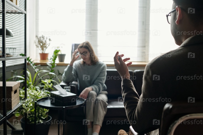 Молодая женщина посещает терапевтический сеанс с мужским консультантом