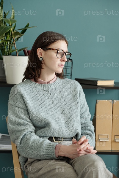 Молодая женщина, сидящая вдумчиво во время сеанса терапии