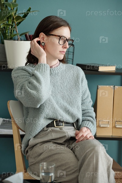 Молодая женщина корректирует серёжку, пока отражает во время терапии