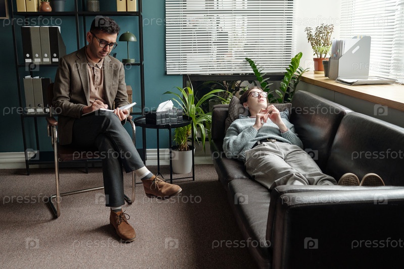 Молодой человек, лежащий на диване и разговаривающий с мужским терапевтом