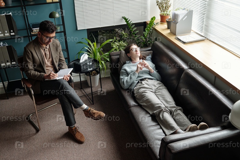 Молодой человек, лежащий на диване и разговаривающий с терапевтом во время консультации