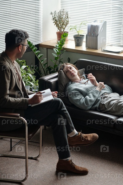Молодая женщина, лежащая на диване, разговаривает с мужским терапевтом во время сеанса