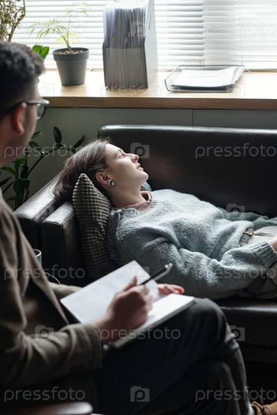 Молодая женщина лежит на диване во время терапевтического сеанса с психотерапевтом
