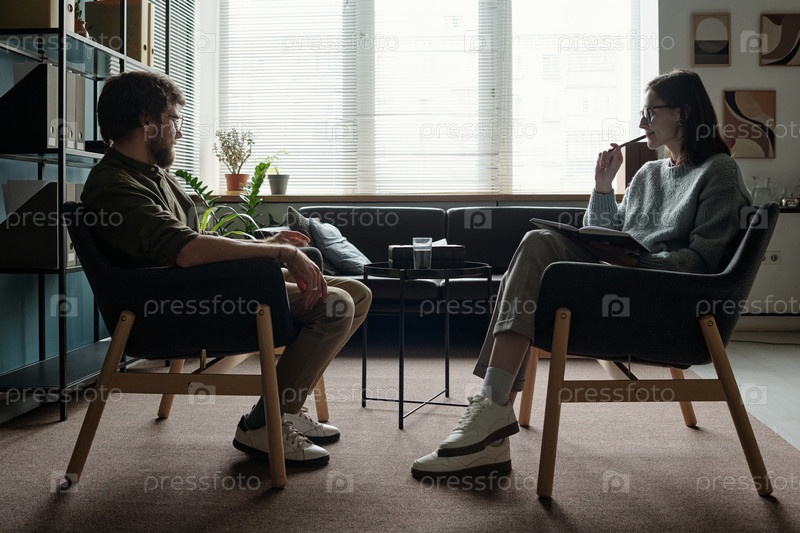 Молодая женщина проводит терапевтический сеанс с молодым человеком