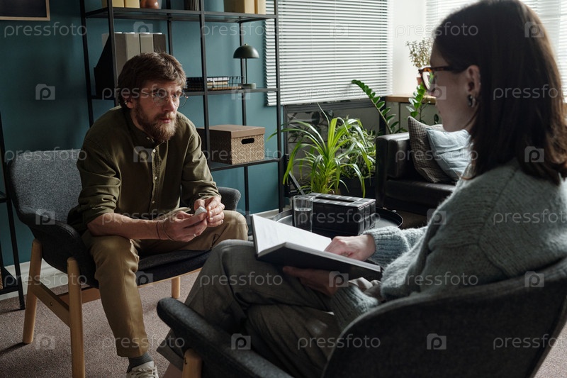 Молодой человек посещает терапевтический сеанс с психотерапевтом