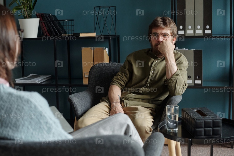 Мужчина, посещающий терапевтический сеанс с женщиной-терапевтом