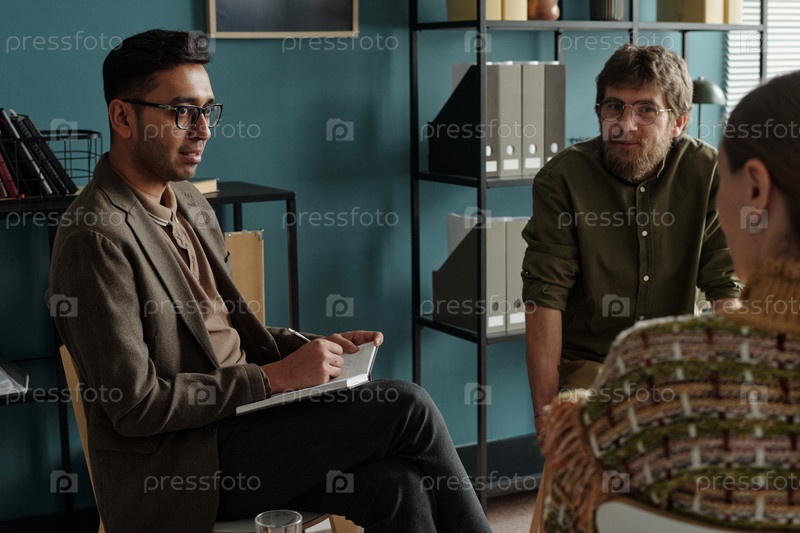 Южноазиатский молодой человек ведет терапевтическую сессию со взрослыми