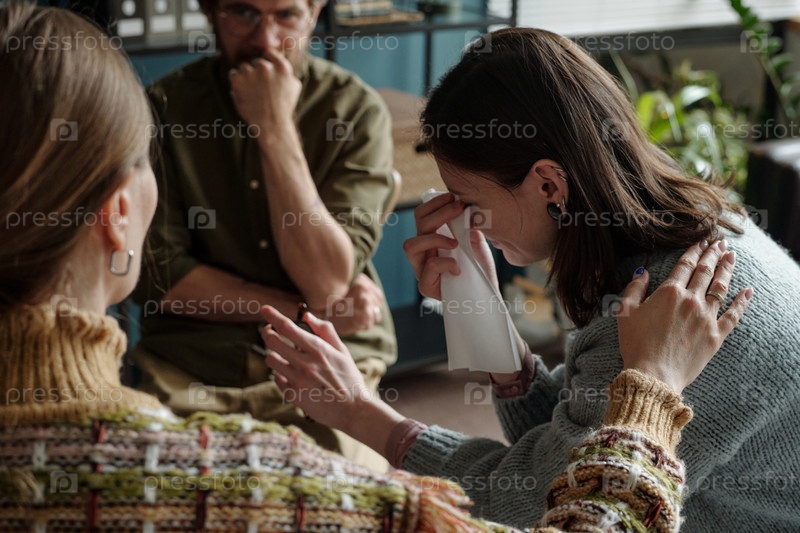 Молодая женщина плачет во время терапевтической сессии с группой поддержки
