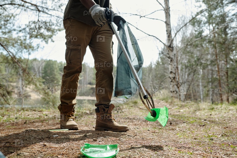 Молодой взрослый чернокожий мужчина собирает мусор на открытом воздухе, используя инструмент для сбора мусора