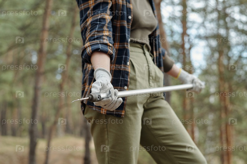 Молодая взрослая женщина убирает лес с помощью мусорщика в дневное время